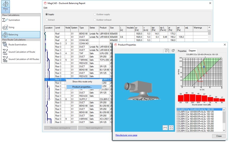 When a ventilation system has been partly or fully modelled, you can easily use the integrated and localised calculation functions in MagiCAD to evaluate system performance.
